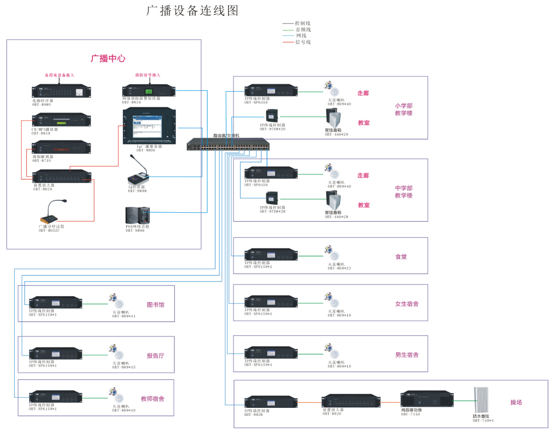 具備有分散式和集中式管理模式,分散式是在學校各個教室、每個廣播區域設置網絡音頻終端,滿足各個教室、各個區域可以進行獨立廣播和控制;集中式是在學校總廣播站設置系統服務器、及各分控站,利用學校網絡,把各個區域廣播音頻終端、網絡尋呼站和分控軟件操作系統連接起來,組成一套數字化網絡廣播系統,進行統一管理。